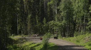 Sow (left) and Boar (right) grizzly feeding along a logging road in remote, central British Columbia